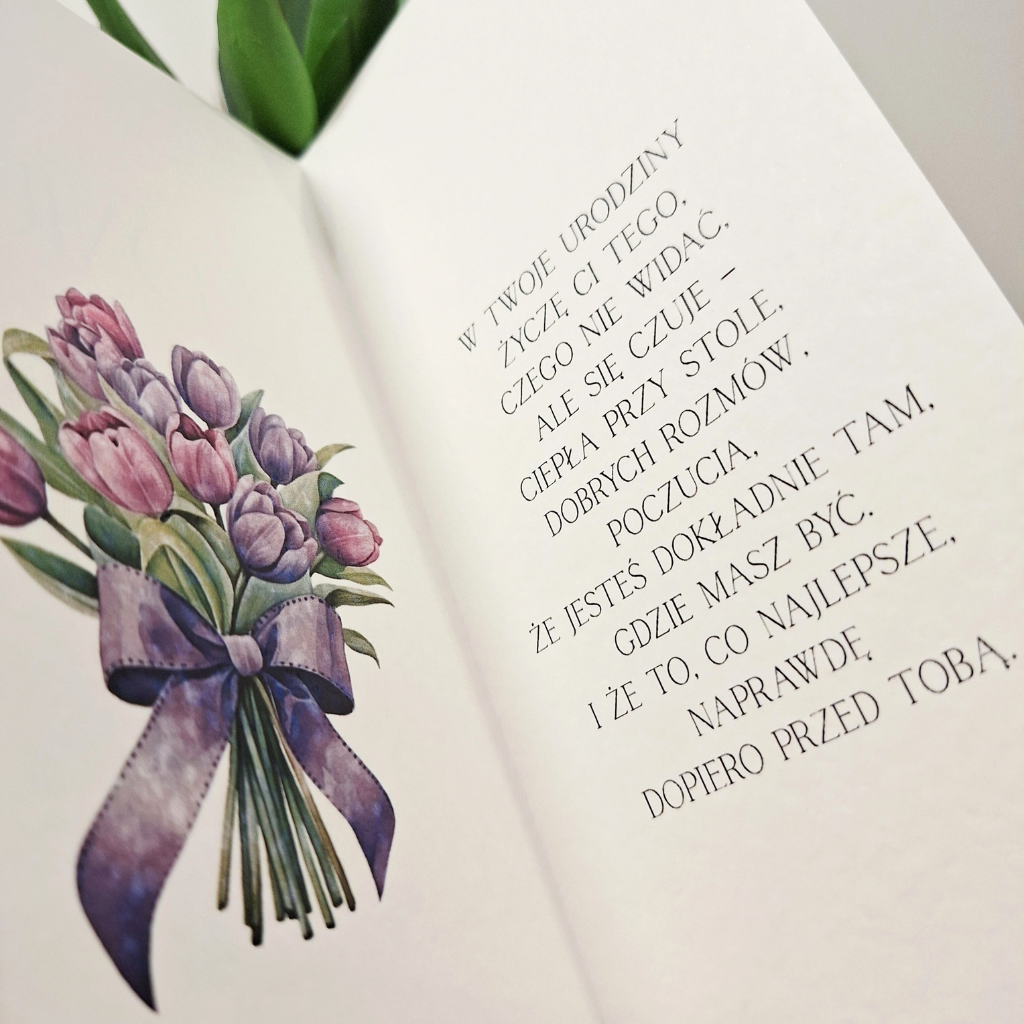W środku wydrukowane są życzenia, dopasowane do charakteru uroczystości, dzięki czemu kartka jest od razu gotowa do wręczenia.