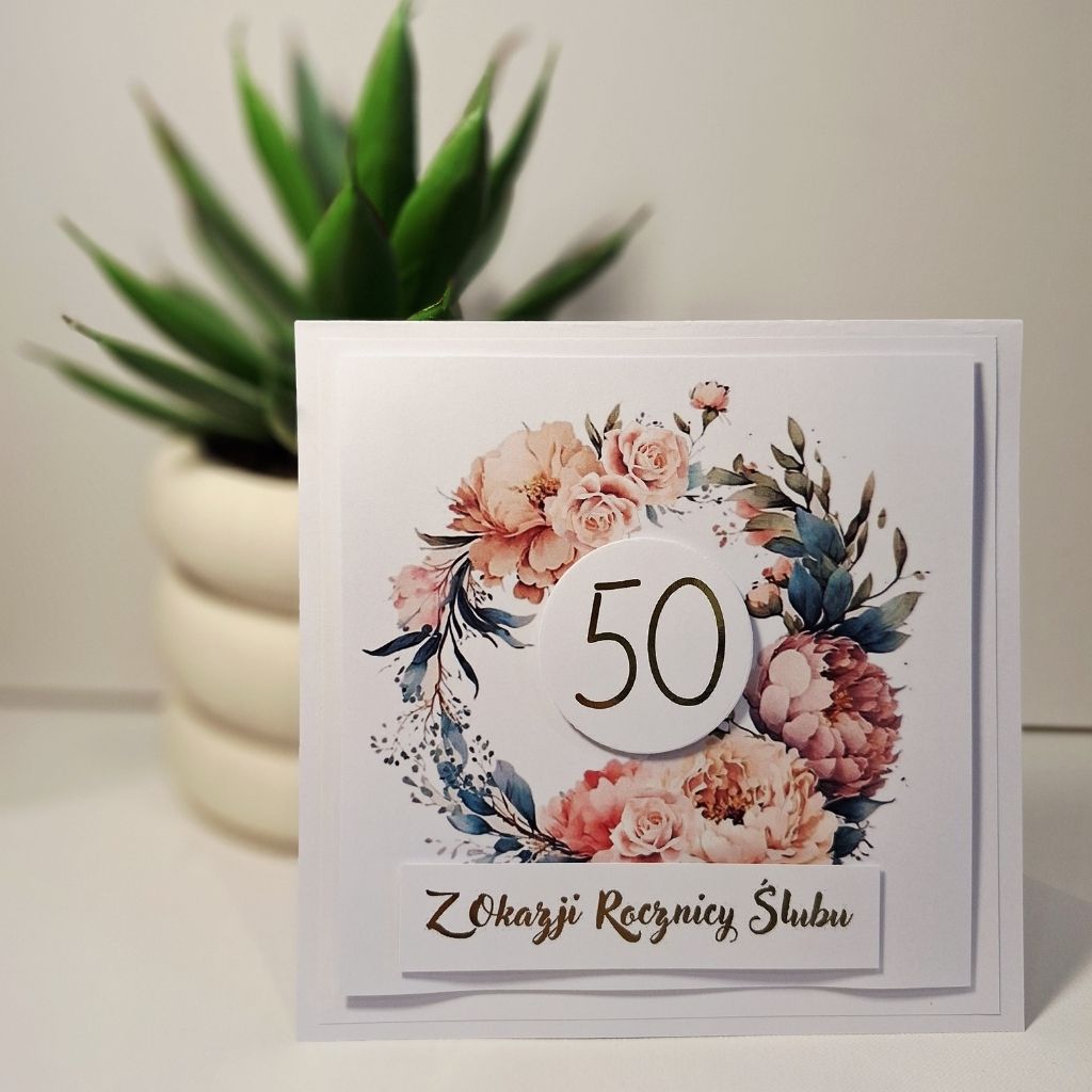 „Kartka Okolicznościowa – Z Okazji 50 Rocznicy Ślubu ” to elegancka, ręcznie robiona kartka, ze złotymi napisami, która pięknie podkreśli tę wyjątkową chwilę. Starannie dobrane kolory, subtelne zdobienia oraz elementy 3D nadają jej niepowtarzalnego charakteru. To idealny sposób, aby w wyjątkowy sposób przekazać swoje myśli i emocje – niezależnie od okazji.