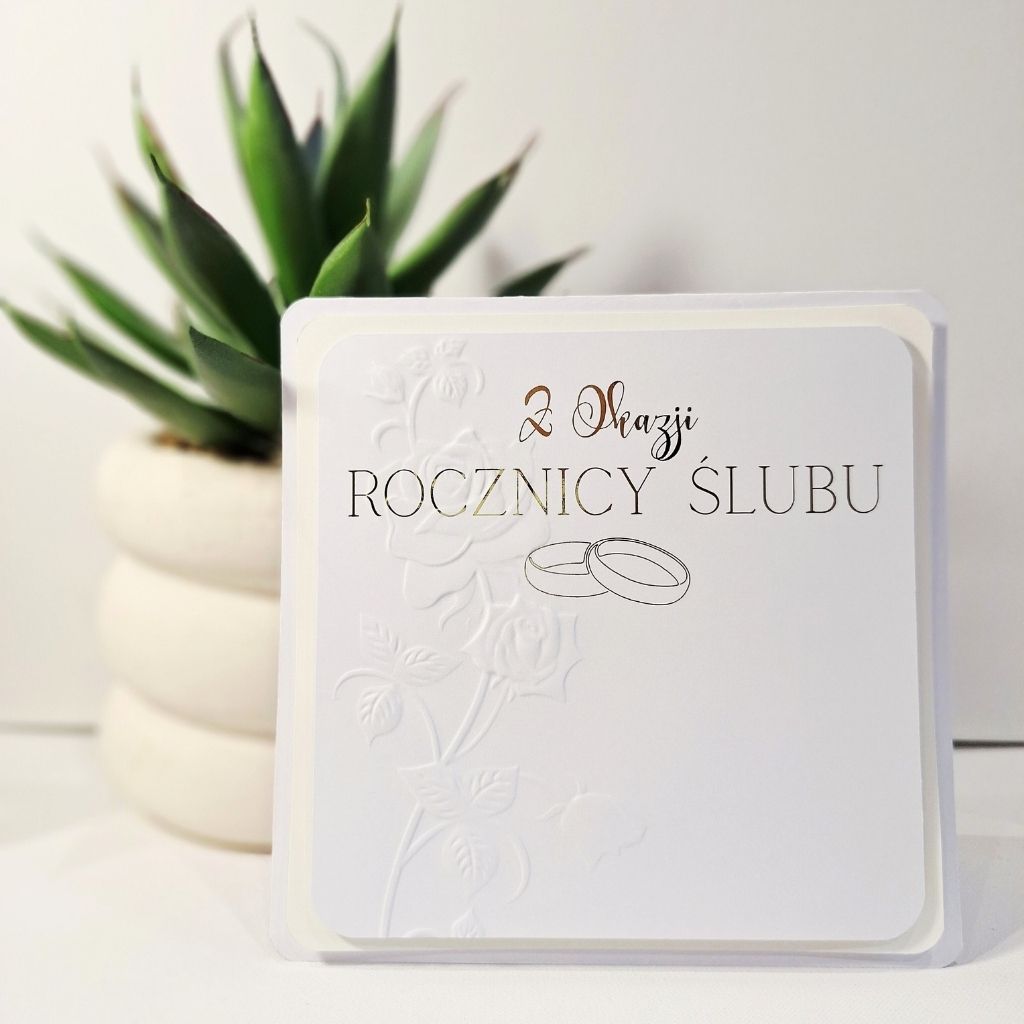 „Kartka okolicznościowa – Z Okazji Rocznicy Ślubu” to elegancka, ręcznie robiona kartka, która pięknie podkreśli tę wyjątkową chwilę. Starannie dobrane kolory, złocone napisy, subtelne zdobienia oraz elementy embossingu nadają jej niepowtarzalnego charakteru. To idealny sposób, aby w wyjątkowy sposób przekazać swoje myśli i emocje – z okazji Rocznicy Ślubu.