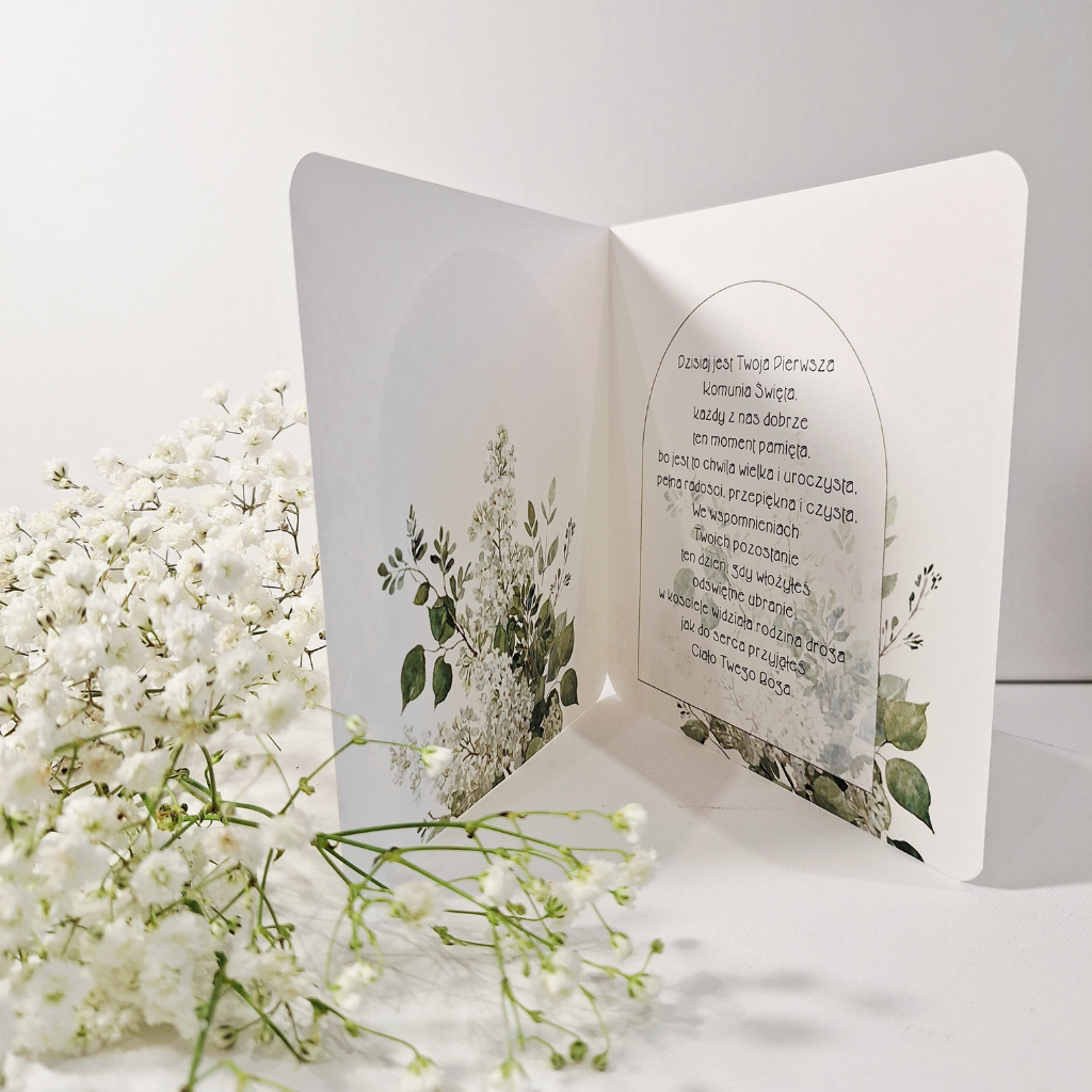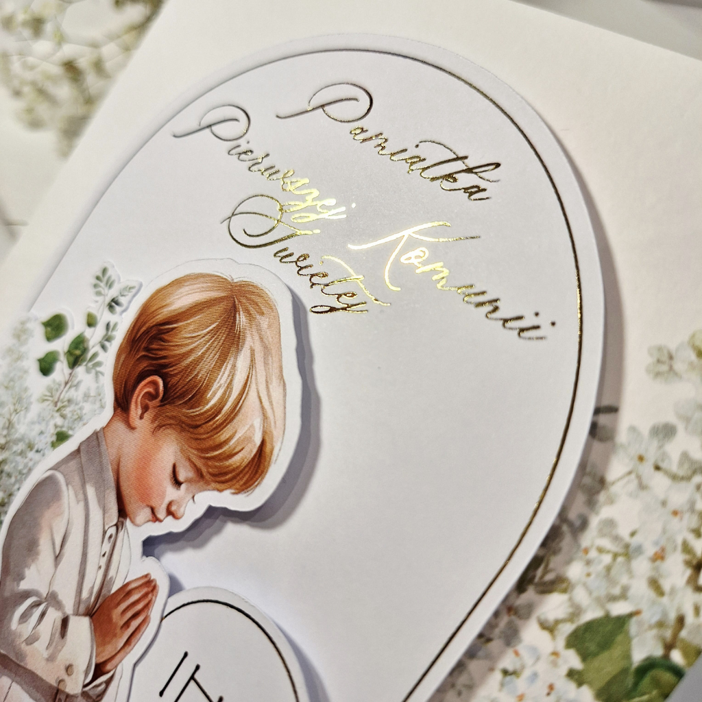 „Pamiątka Pierwszej Komunii Świętej” – To elegancka kartka w formacie kwadratu z złoconymi napisami z okazji Pierwszej Komunii Świętej, wykonana ręcznie z ogromną dbałością o każdy detal. Jest idealnym sposobem na przekazanie ciepłych słów w tym wyjątkowym dniu. Została zaprojektowana z myślą o zachowaniu najpiękniejszych wspomnień, łącząc tradycyjne symbole z nowoczesnym designem.