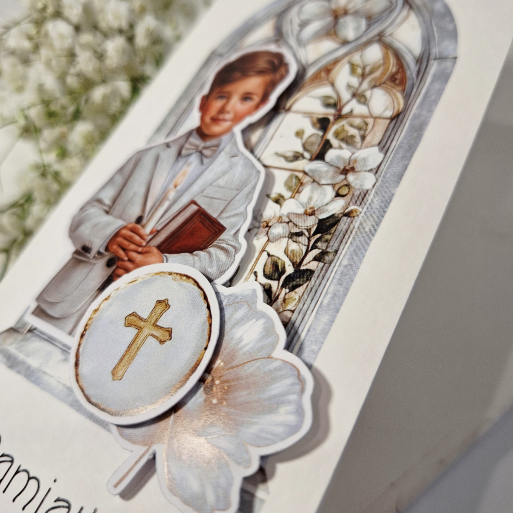 „Pamiątka Pierwszej Komunii Świętej” – To elegancka kartka w formacie DL z okazji Pierwszej Komunii Świętej, wykonana ręcznie z ogromną dbałością o każdy detal. Jest idealnym sposobem na przekazanie ciepłych słów w tym wyjątkowym dniu. Została zaprojektowana z myślą o zachowaniu najpiękniejszych wspomnień, łącząc tradycyjne symbole z nowoczesnym designem.