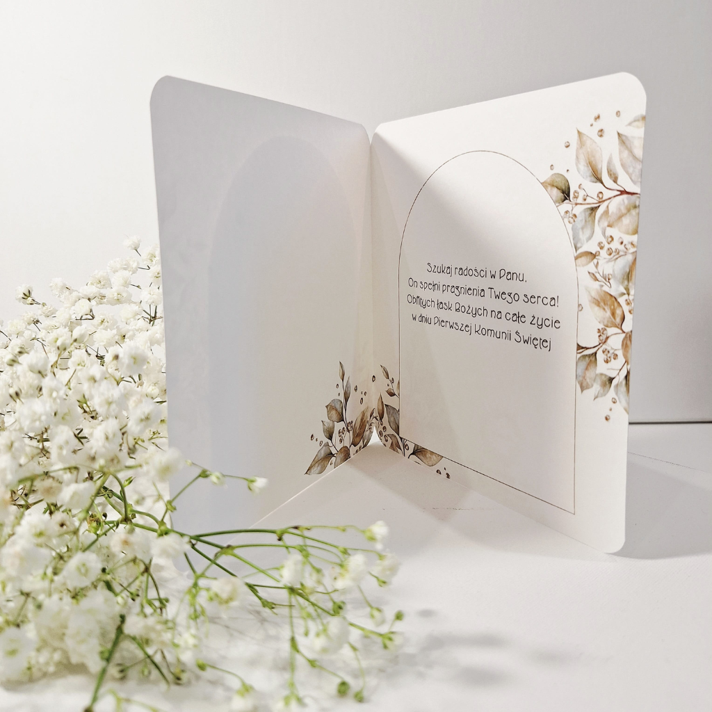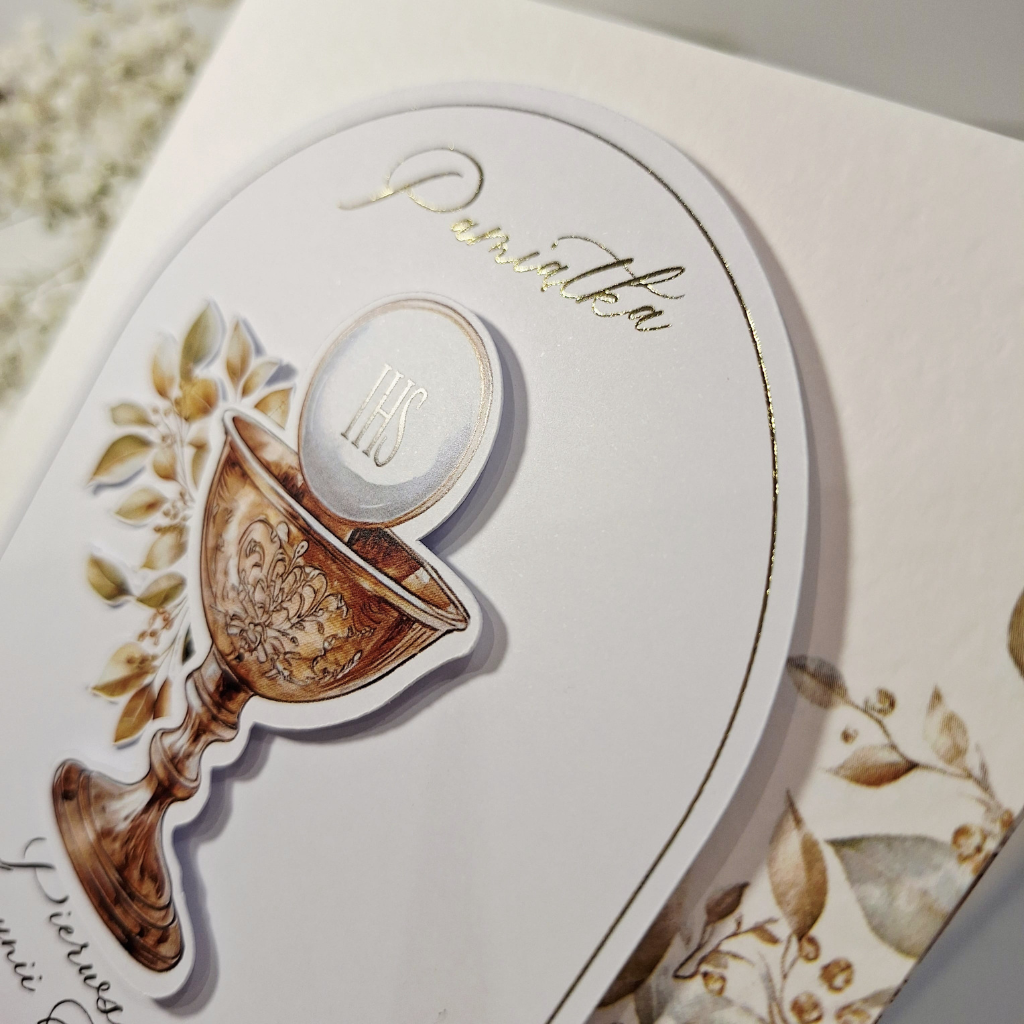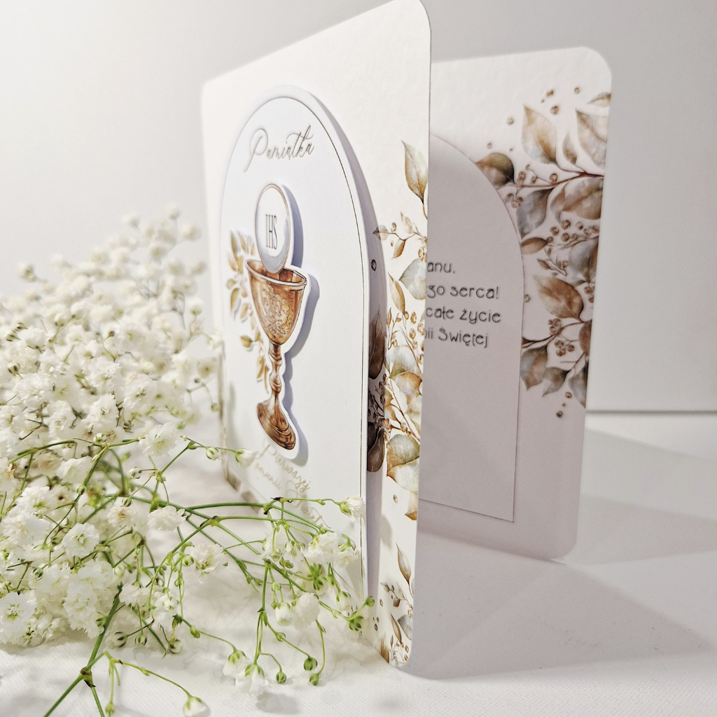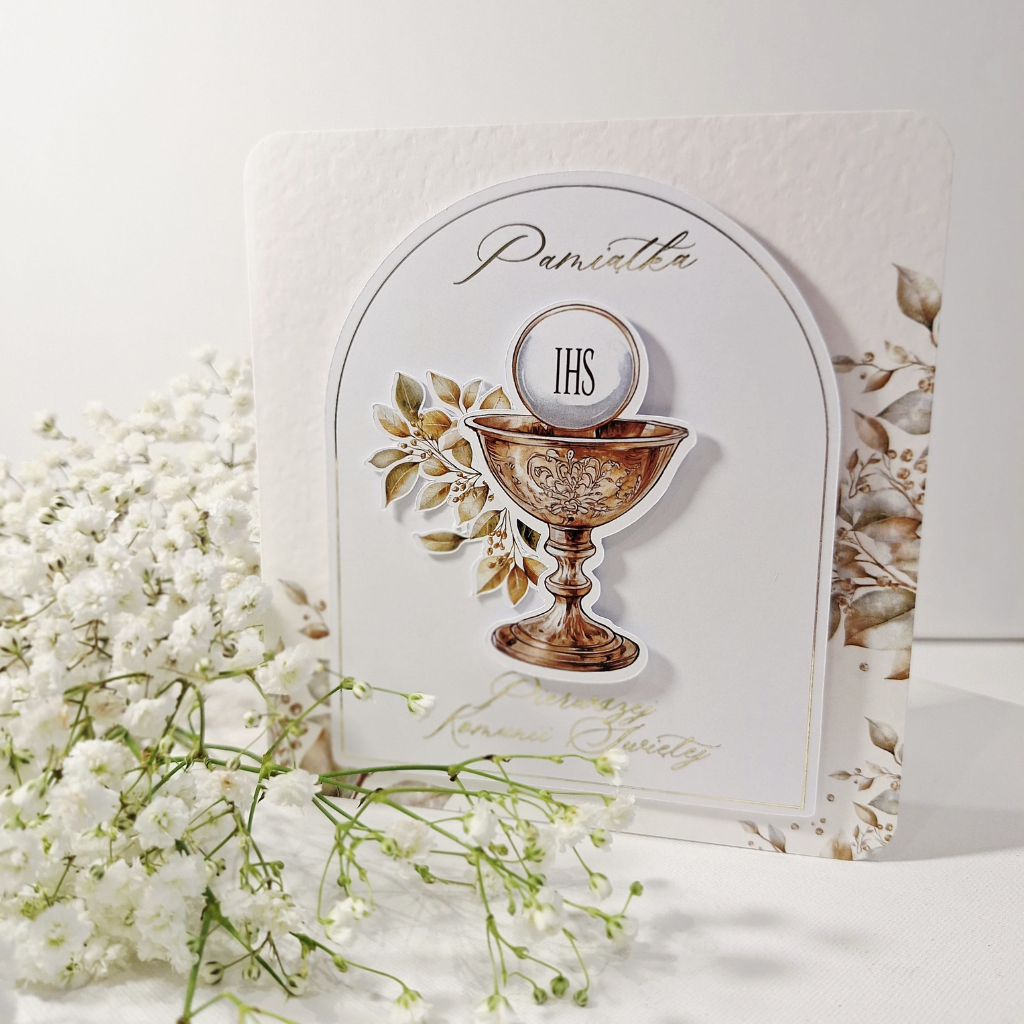 „Pamiątka Pierwszej Komunii Świętej” – To elegancka kartka w formacie kwadratu z złoconymi napisami z okazji Pierwszej Komunii Świętej, wykonana ręcznie z ogromną dbałością o każdy detal. Jest idealnym sposobem na przekazanie ciepłych słów w tym wyjątkowym dniu. Została zaprojektowana z myślą o zachowaniu najpiękniejszych wspomnień, łącząc tradycyjne symbole z nowoczesnym designem.