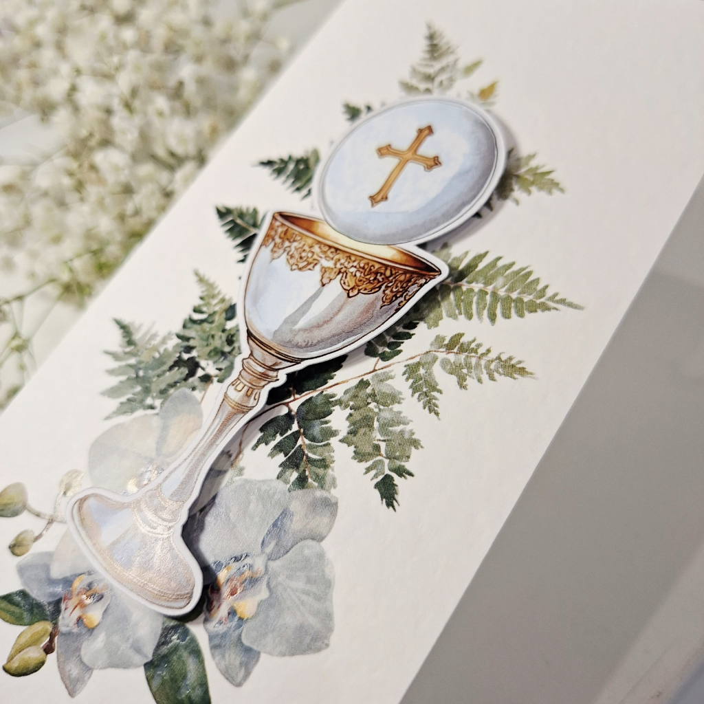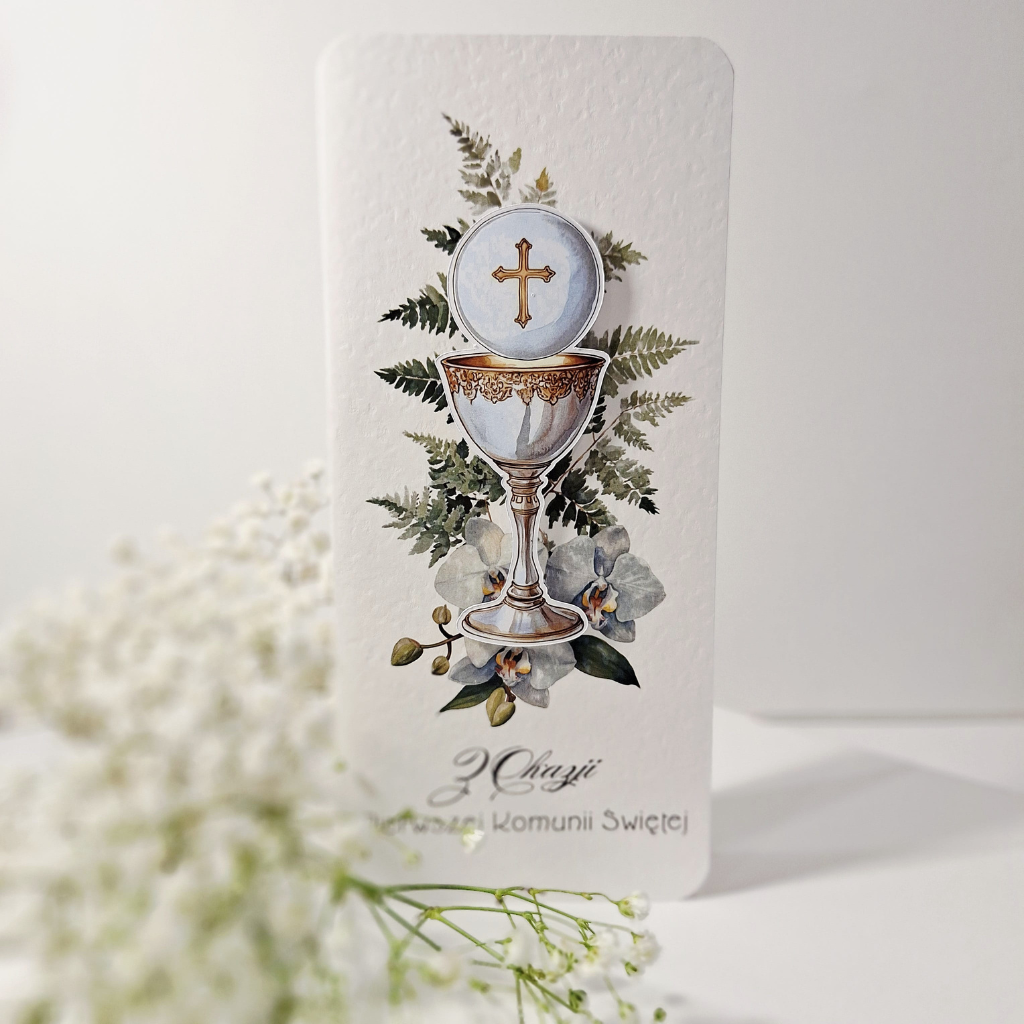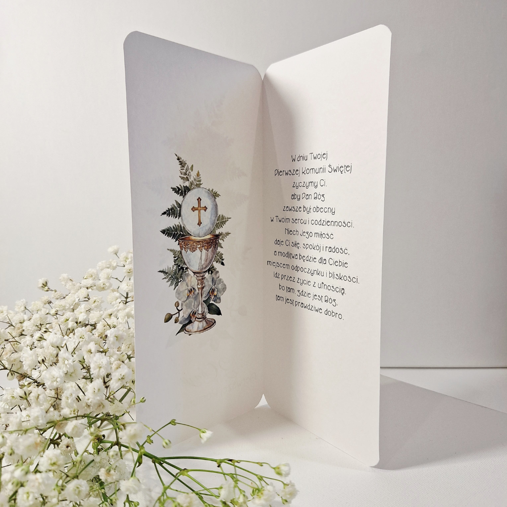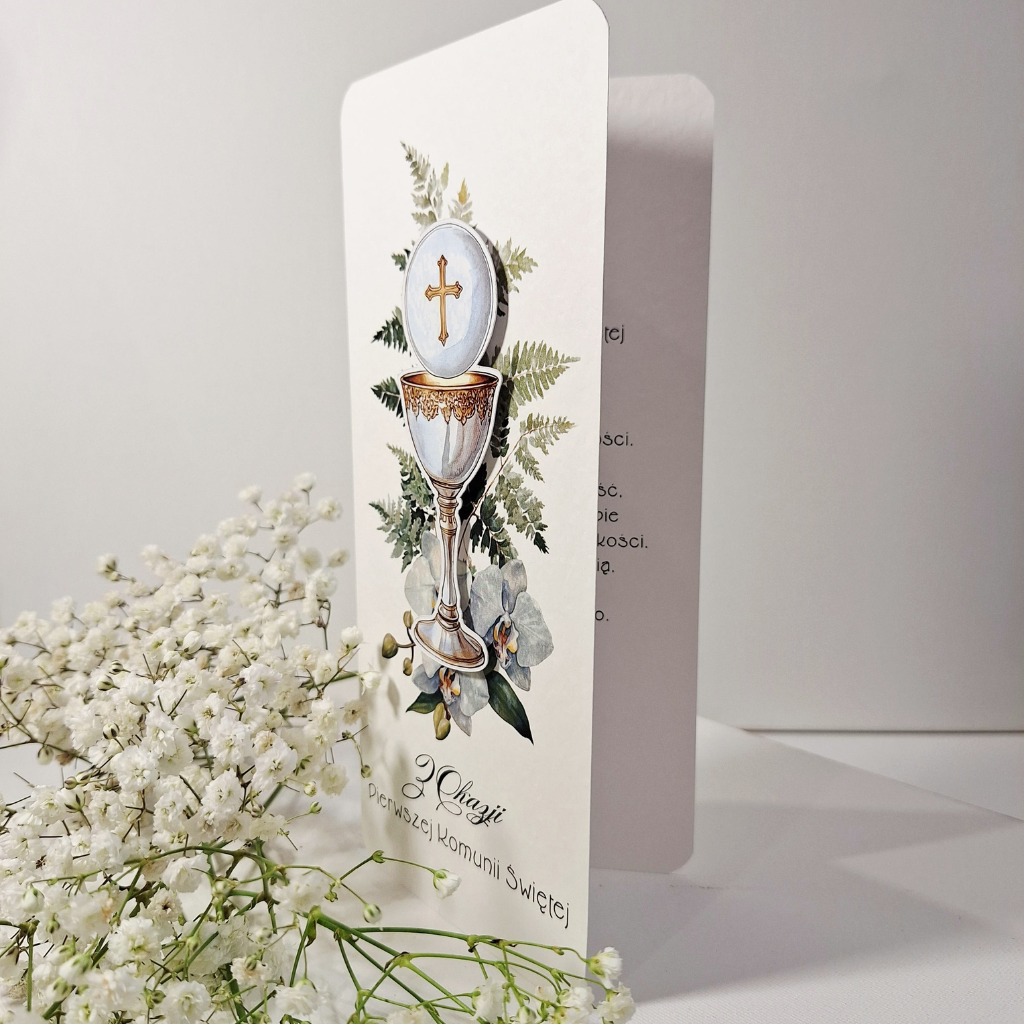 „Z Okazji Pierwszej Komunii Świętej” – To elegancka kartka w formacie DL z okazji Pierwszej Komunii Świętej, wykonana ręcznie z ogromną dbałością o każdy detal. Jest idealnym sposobem na przekazanie ciepłych słów w tym wyjątkowym dniu. Została zaprojektowana z myślą o zachowaniu najpiękniejszych wspomnień, łącząc tradycyjne symbole z nowoczesnym designem.